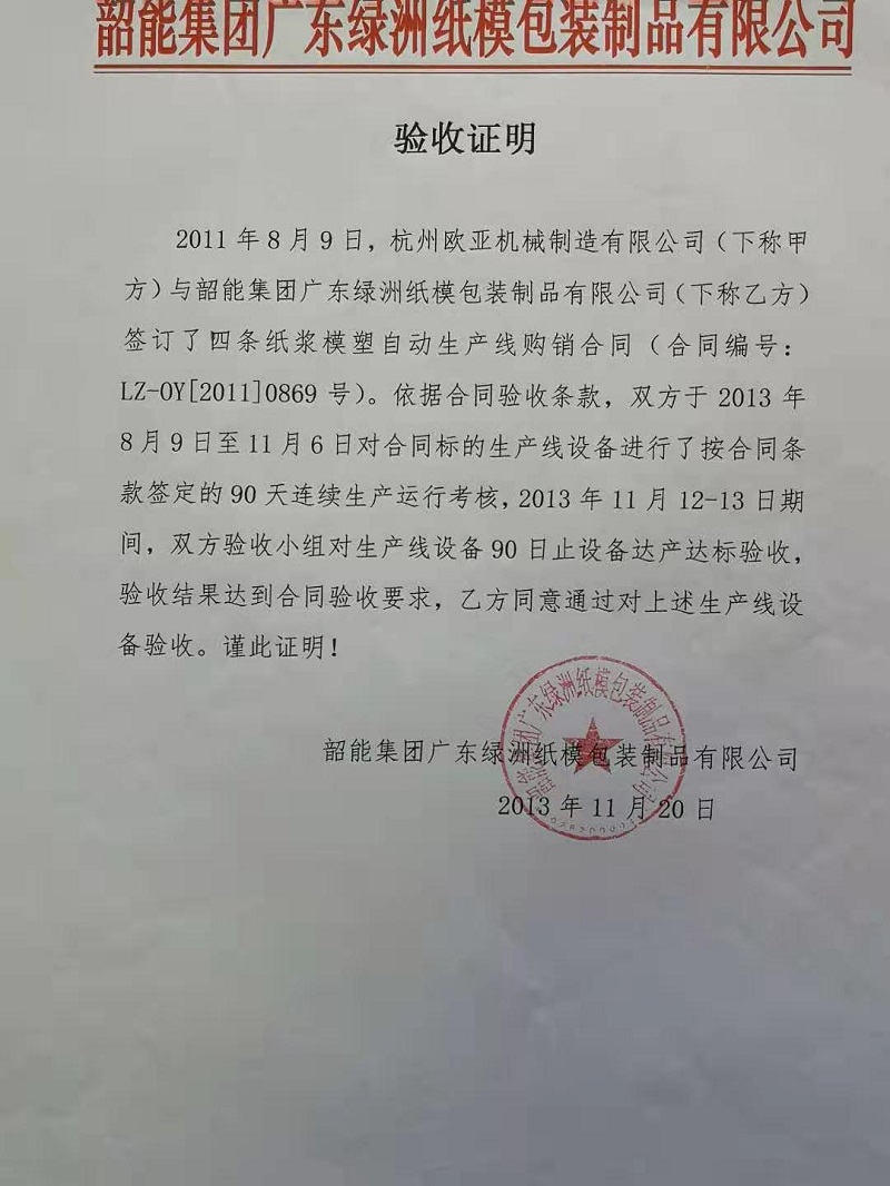 韶能集團(tuán)廣東綠洲紙模包裝制品有限公司,是著名的紙漿模塑餐包生產(chǎn)企業(yè)。從2010年開始,綠洲公司前后分4期共購買浙江歐亞AE920型全自動(dòng)紙漿模塑設(shè)備(植物纖維餐具)生產(chǎn)線72臺(tái),全部達(dá)到產(chǎn)量和質(zhì)量標(biāo)準(zhǔn),并通過驗(yàn)收。