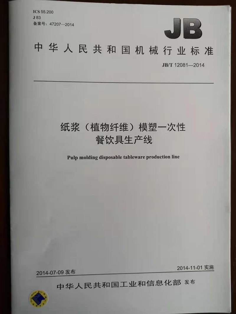 中華人民共和國(guó)行業(yè)標(biāo)準(zhǔn):?紙漿(植物纖維)模塑一次性餐飲具生產(chǎn)線?2014-11-1實(shí)施。標(biāo)準(zhǔn)代號(hào)JB/T 12081-2014。本標(biāo)準(zhǔn)由鄭天波起草。是關(guān)于環(huán)保餐具設(shè)備生產(chǎn)線的紙漿模塑設(shè)備方面的第一個(gè)行業(yè)標(biāo)準(zhǔn)。